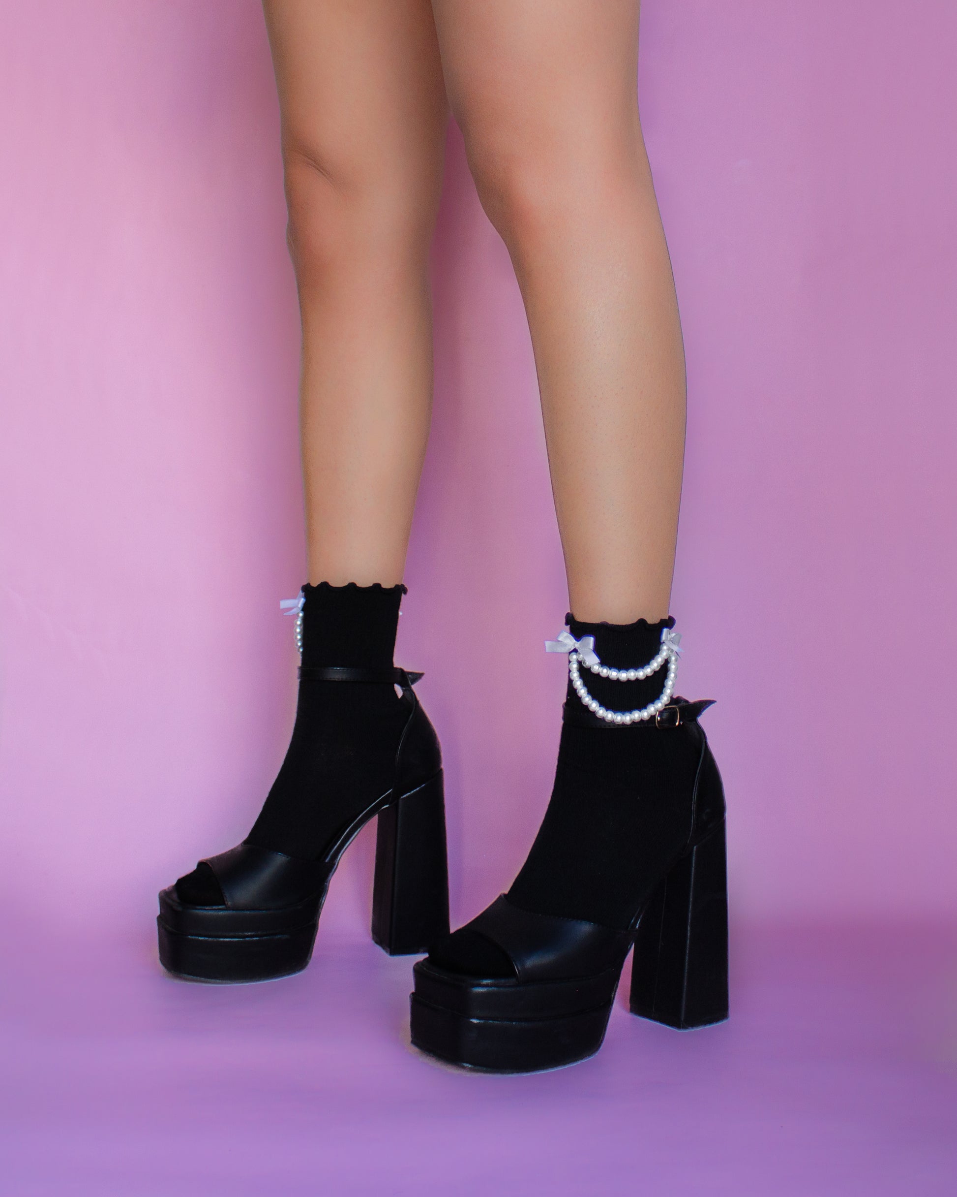 Calcetines negros de algodón con detalle de perlas y moños blancos