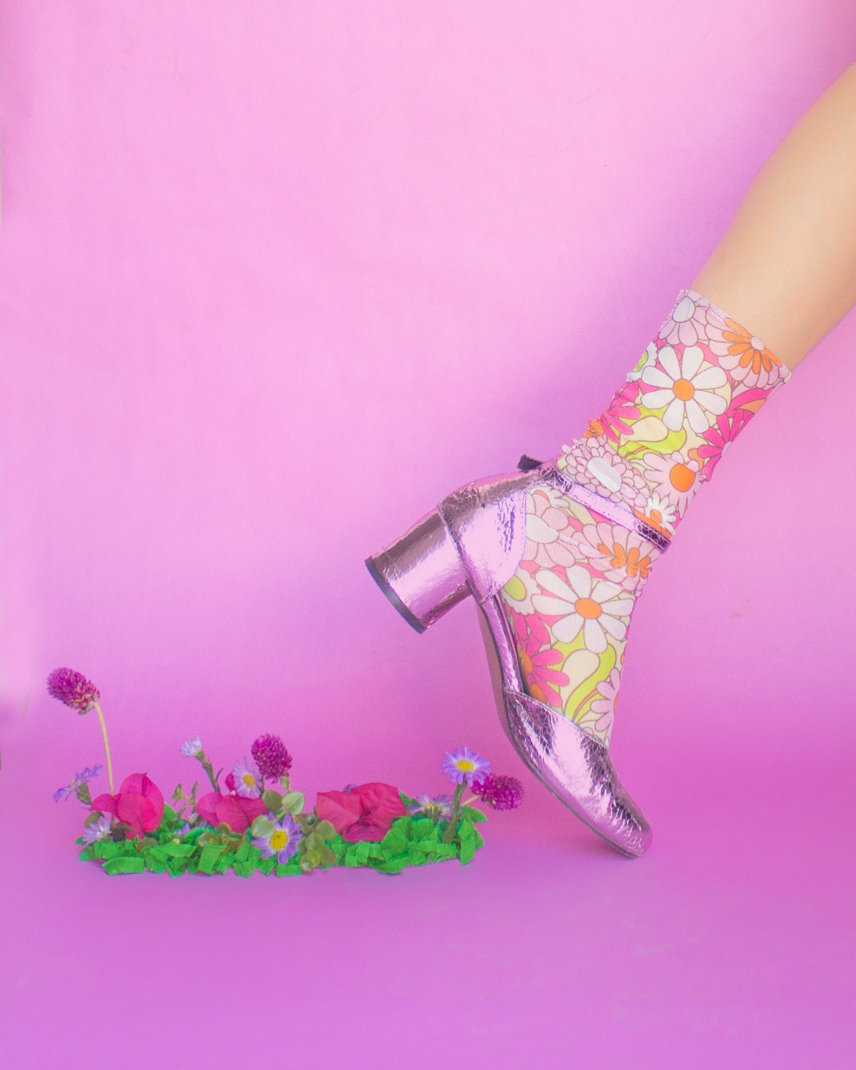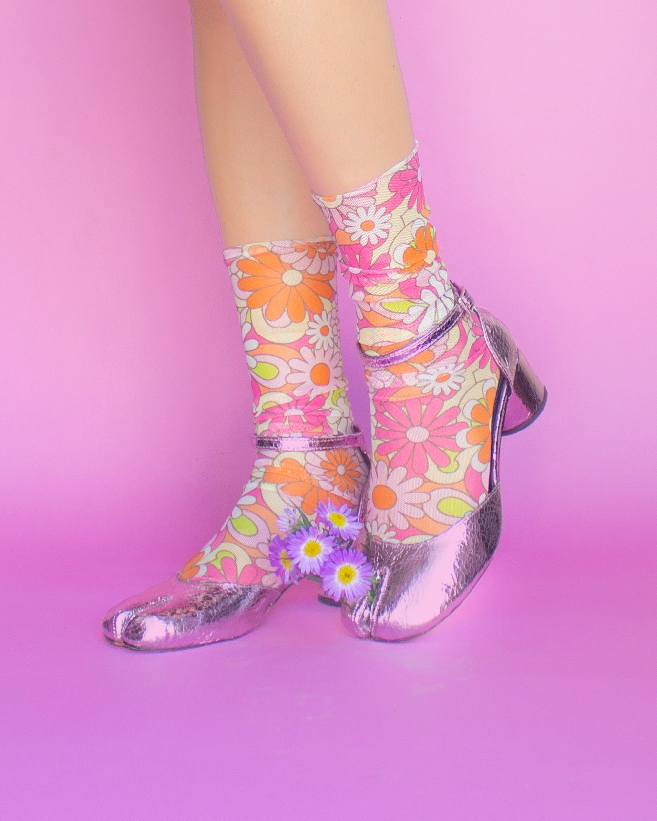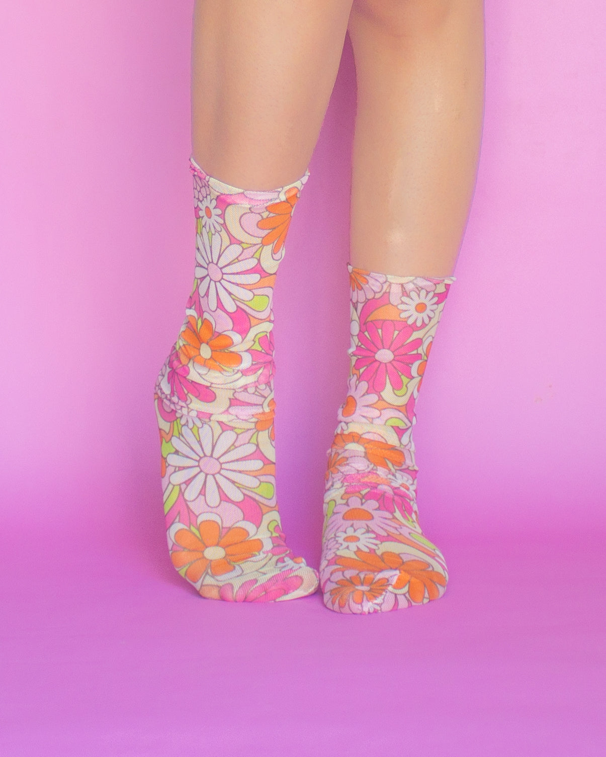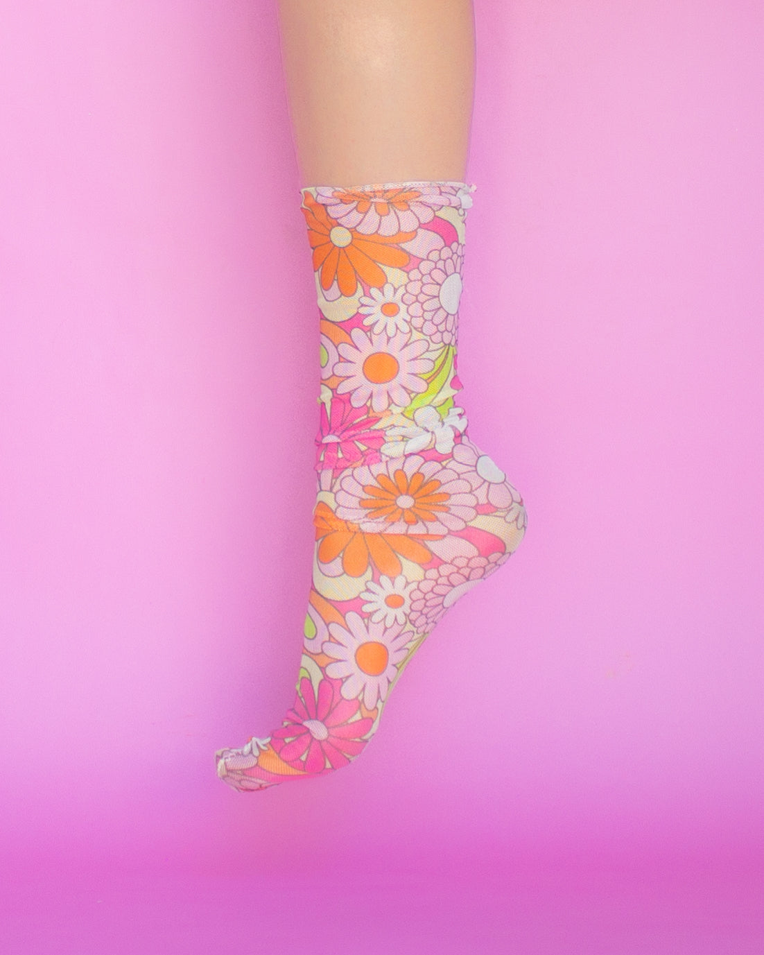 Calcetines de malla con estampado de flores multicolor en rosa, naranja y verde